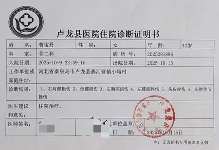 2025年10月9日,我去秦皇岛火车站乘车去京看病,被镇里的工作人员拦截,抢走我的手机和包,强行把我抬到车里带回,分别有黄某、董某亮、孙某等8个人,当时给我吓坏了,身体受到伤害,住院住了5天,颈椎压迫严重动脖子左右都费劲。至今也未康复。